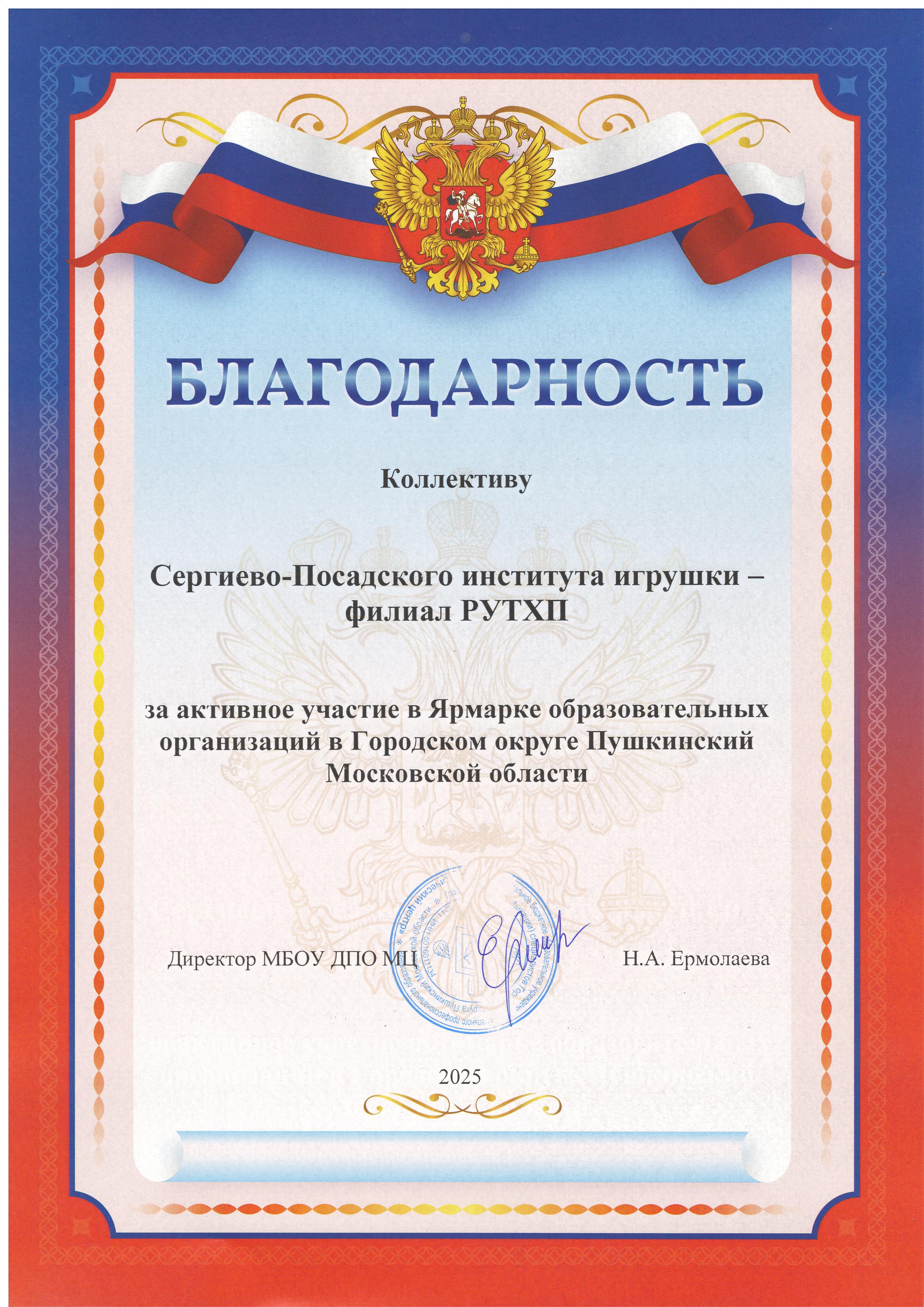 20 сентября 2025 года в рамках муниципального проекта «Семь шагов к профессии» Сергиево-Посадский институт игрушки принял участие в Ярмарке образовательных организаций Городского округа Пушкинский Московской области. Преподаватели Назарова О.Г. и Сергеева Е.Г. ознакомили обучающихся 9-11 классов и их родителей с информацией о направлениях и специальностях. Данные ярмарки призваны помочь школьникам определиться с будущей профессией или вузом.