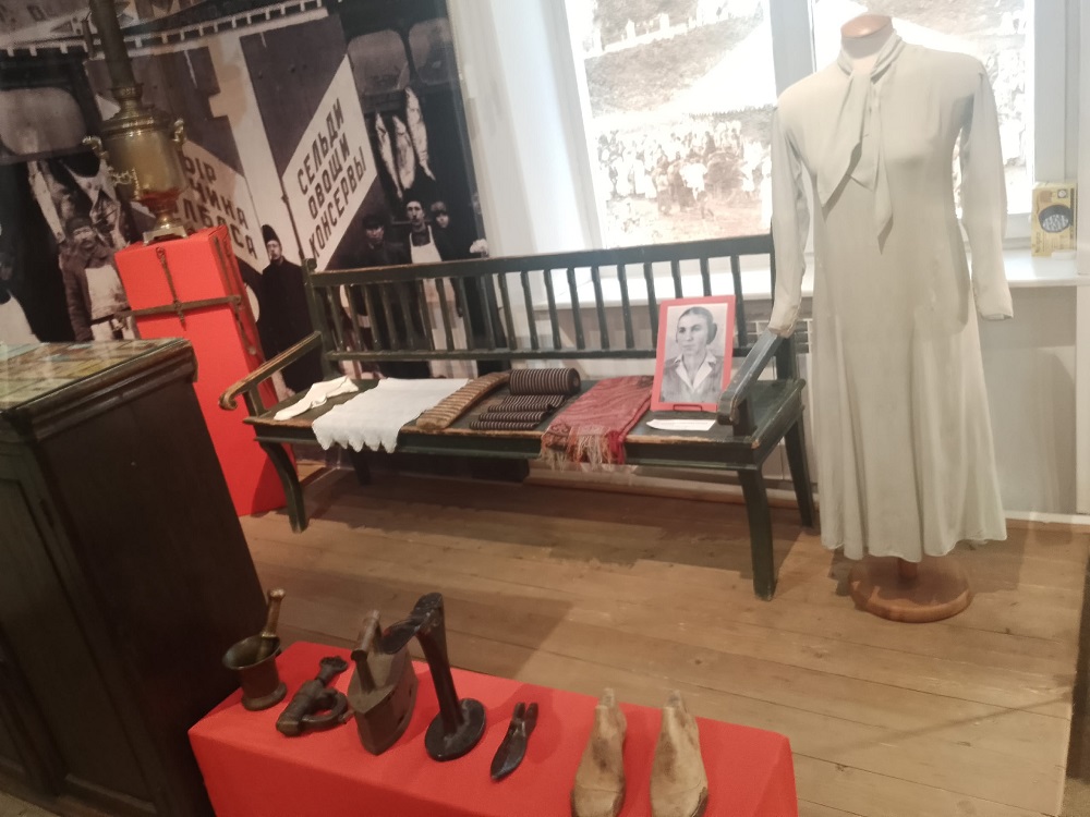 В экспозиции были представлены материальные свидетельства эпохи: подлинные документы, фотографии, картины и литографии, изделия местных кустарей, мебель, предметы быта, костюмы и аксессуары. Эти экспонаты размещены в интерьерных реконструкциях и характеризуют каждое десятилетие XX века.