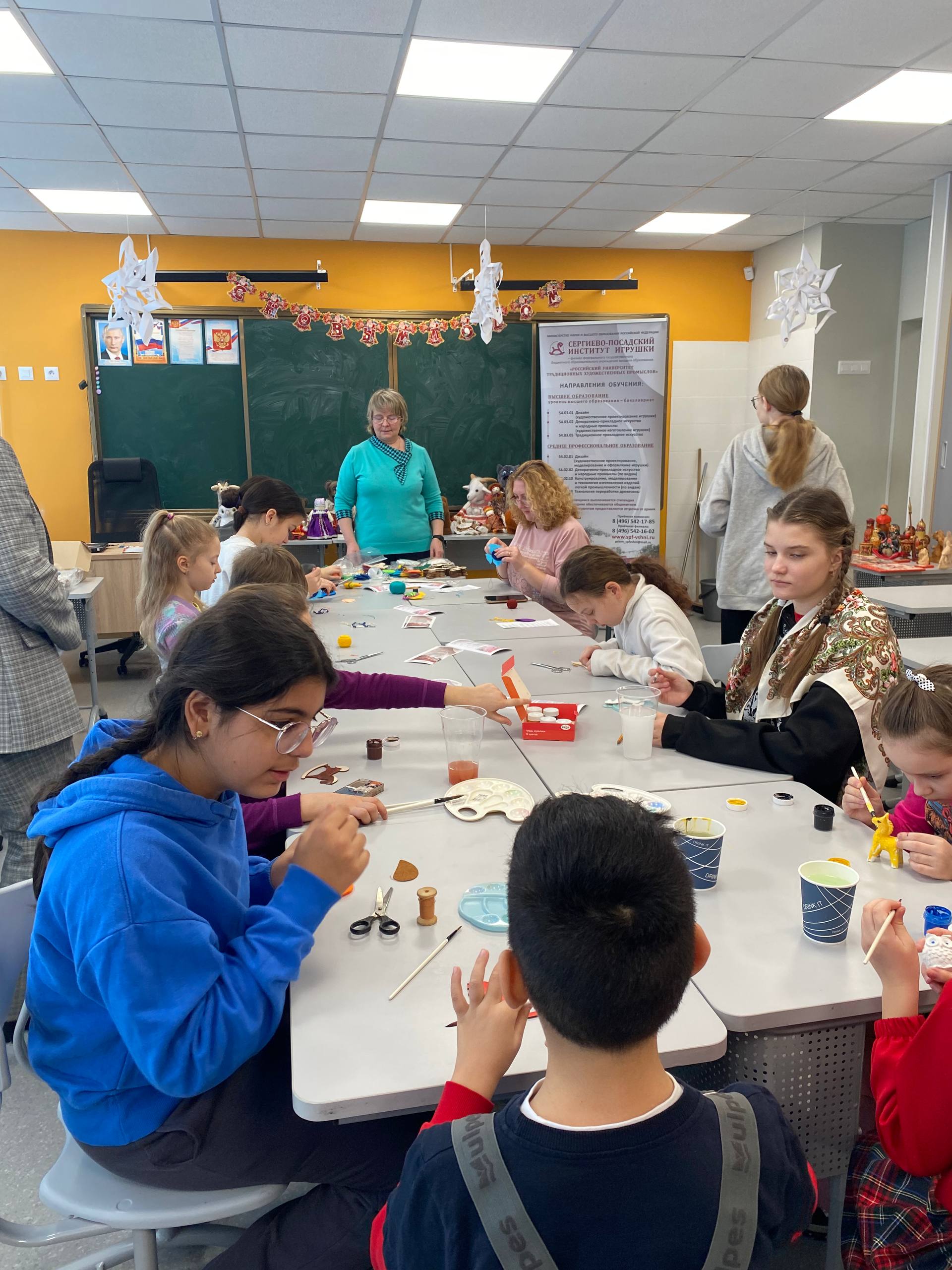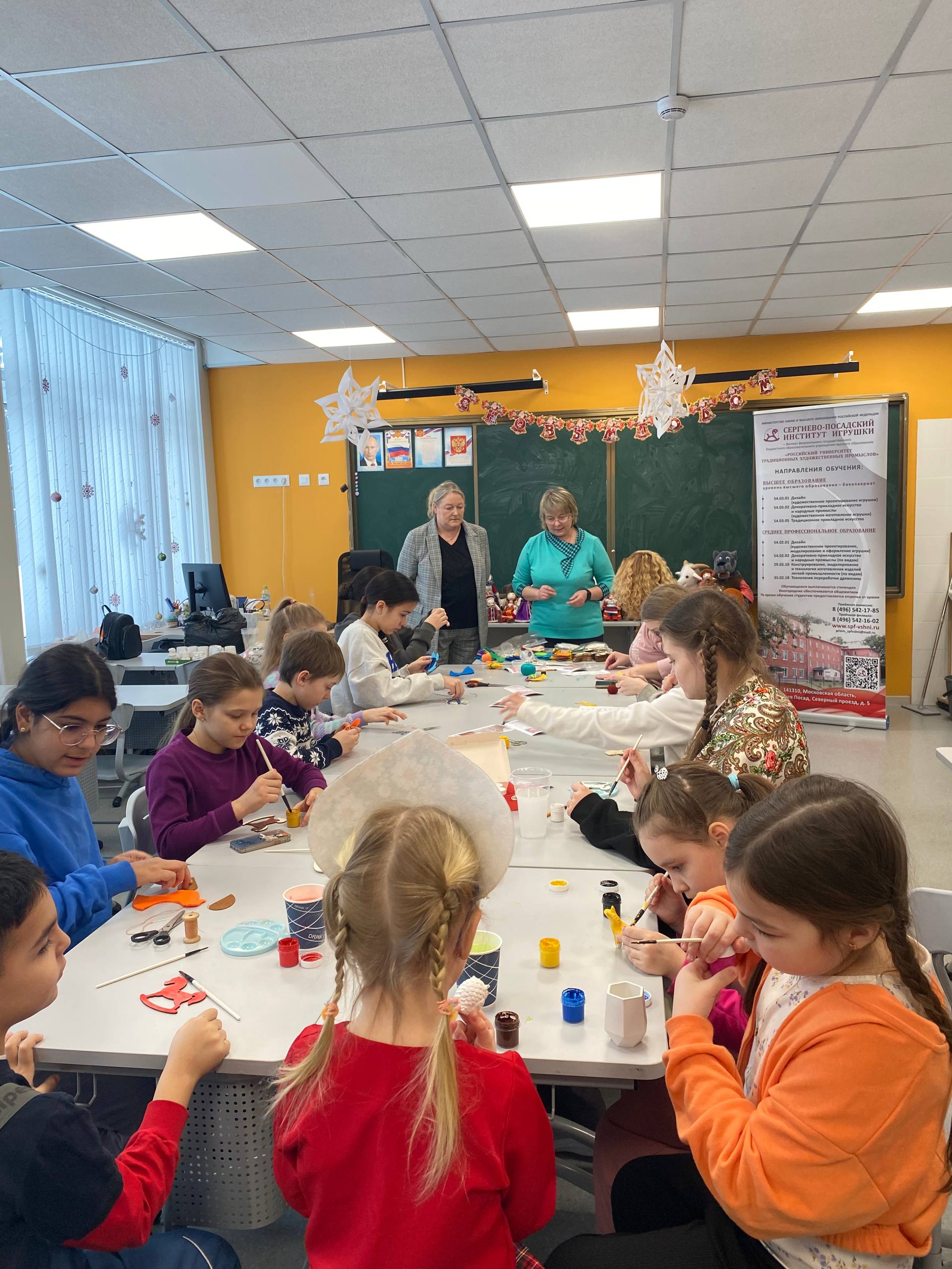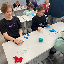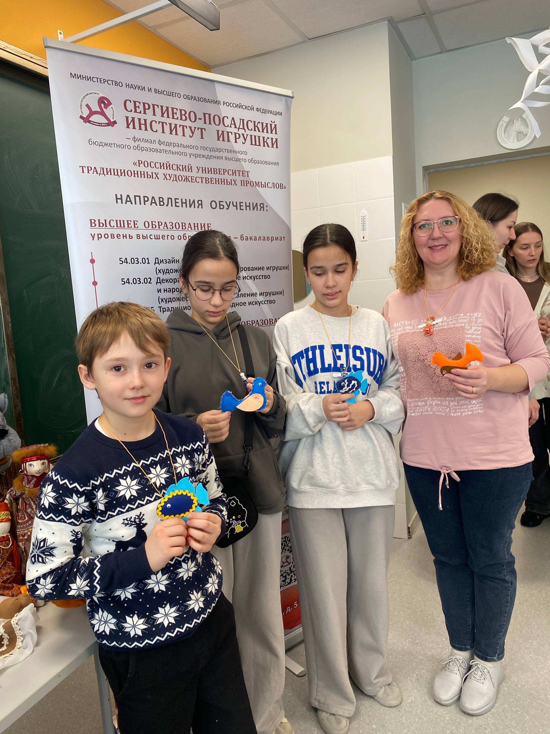 21 февраля 2026 года исполняющий обязанности директора Назарова О.Г. и заведующий кафедрой профессиональных дисциплин Баранова Д.Н. приняли участие в Дне народных промыслов в школах Подмосковья в Гимназии №3 г. Ивантеевка городского округа Пушкинский Московской области, где провели профориентационную работу и мастер-классы: по тряпичной кукле «Крестушка», «Куватка», мягкой игрушке «Рыбка», «Лошадка», «Птица», по росписи деревянной лошадки и росписи гипсовых фигурок.