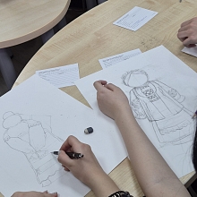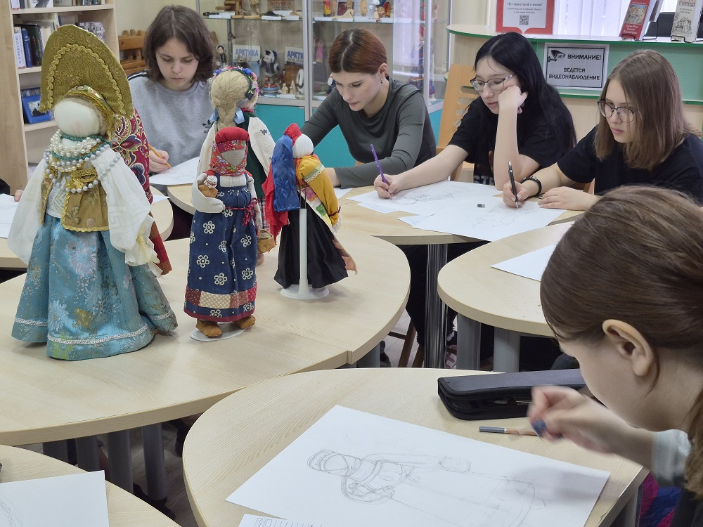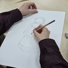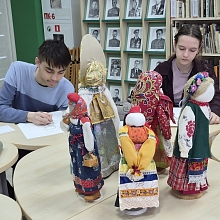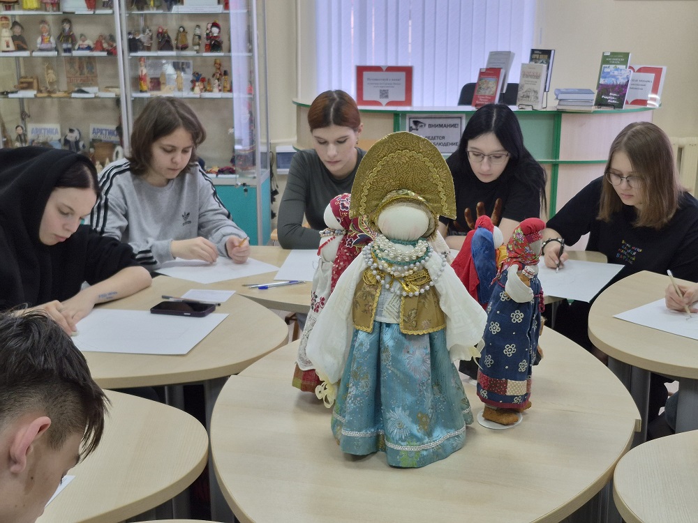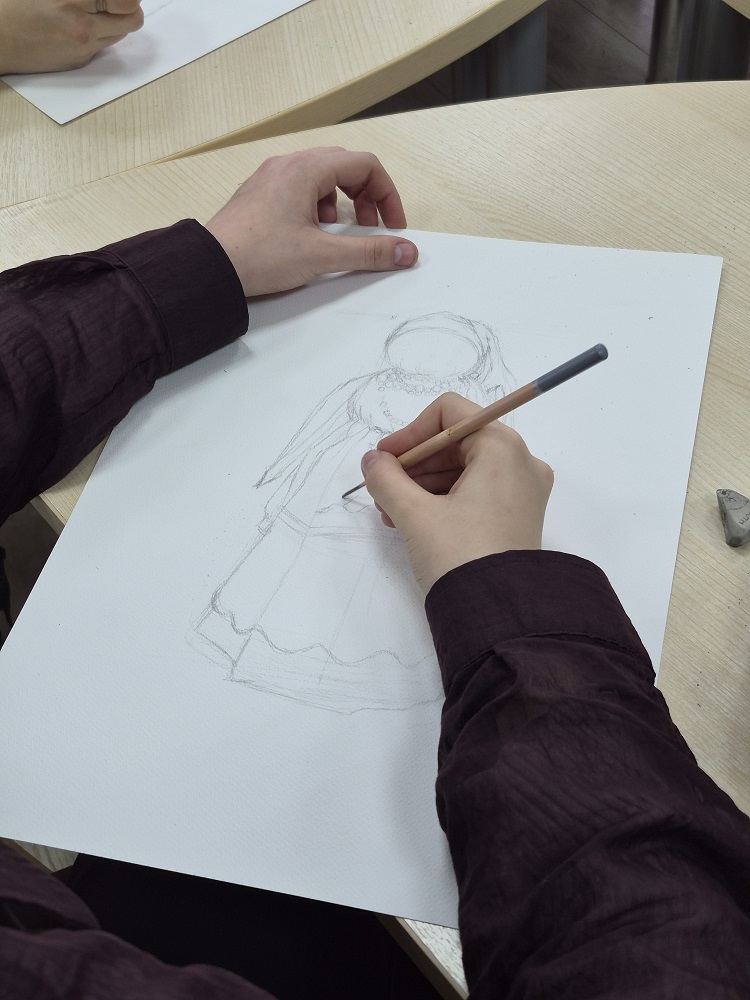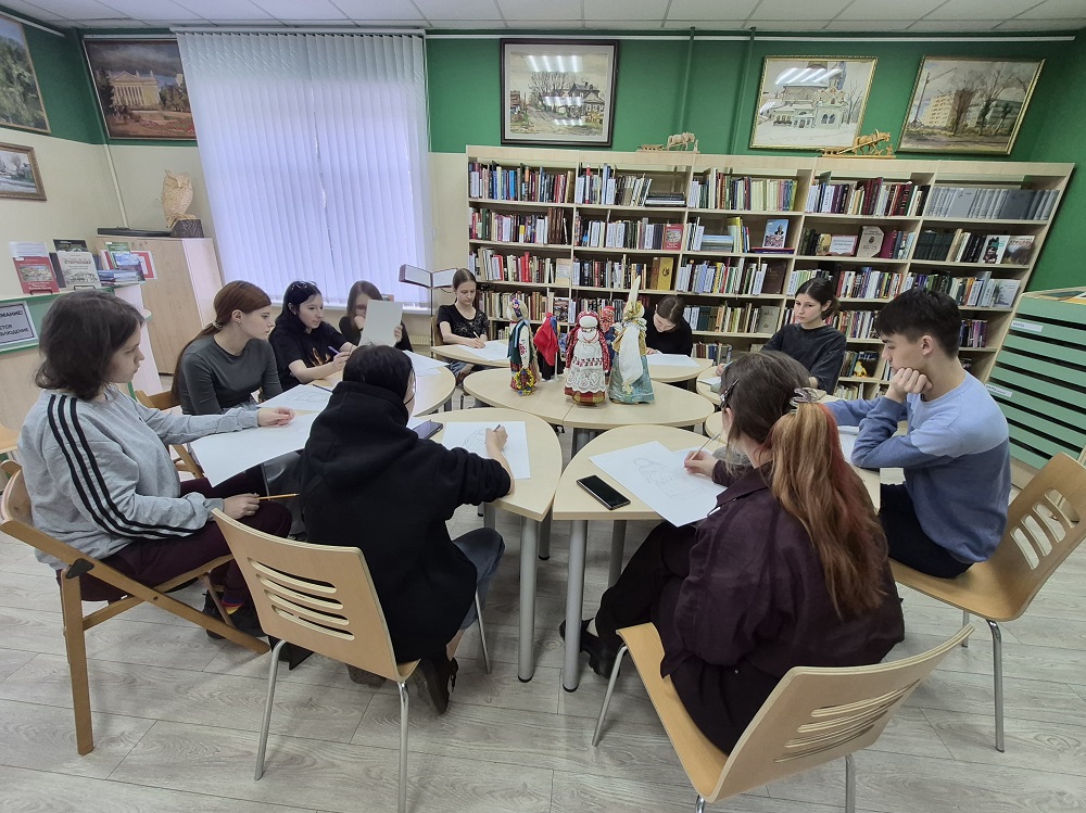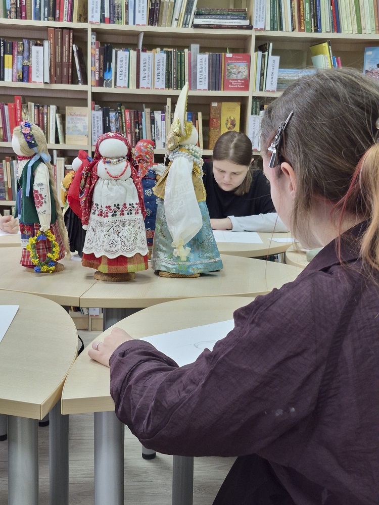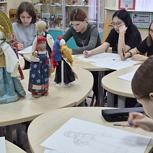 В рамках мероприятия для студентов была организована практическая часть - выполнение набросков с натуры тряпичной куклы, представленной на выставке.